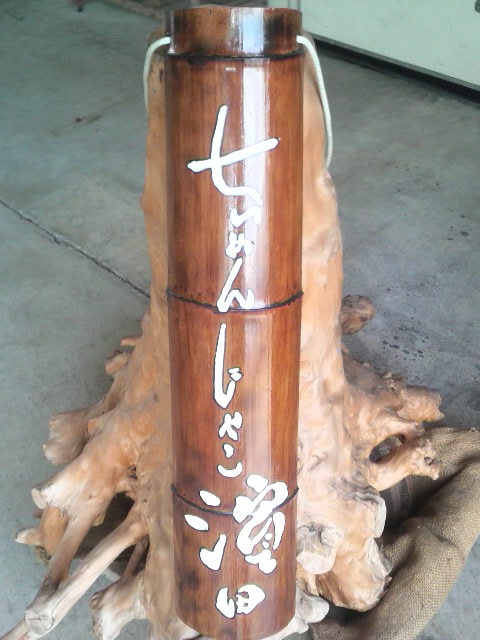 竹に字を彫り加工して看板を作って持ってこられました