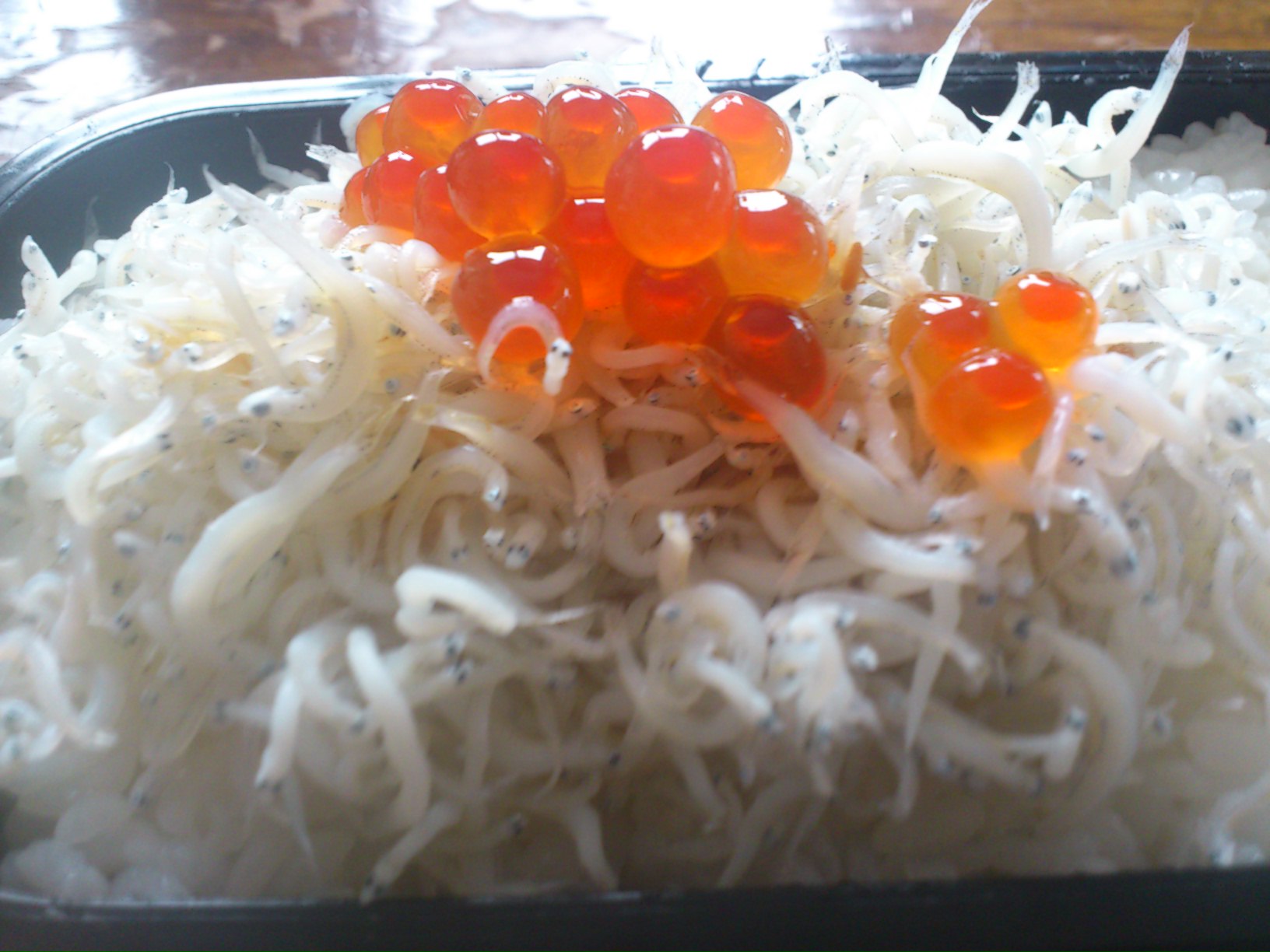 本日 天候晴れ朝からちりめんじゃこが順調に獲れております暑さを乗り越えるためには、しっかり食事もとらなければ!!いつもお昼ごはんは、みんな弁当を持ってきてわいわいと賑やかに食べております^^今日は、獲れたての釜揚げシラスといただいたイクラを弁当のご飯にのせて食べることに!さっそく釜茹でしたばかりのシラスをのっけてみました茹でたてなのでシラスも暖かくふわふわでとてもおいしいミニ丼ぶりとなりました〜浜田水産